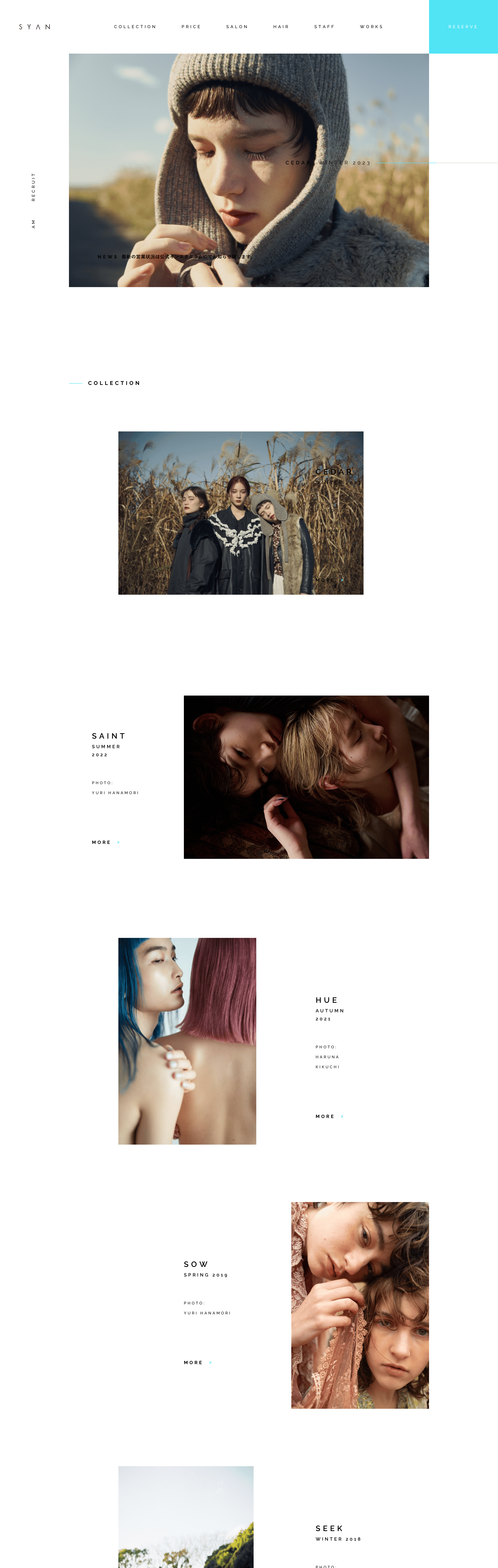 表参道にあるサロン、SYAN のショップサイト。色味を抑えた抜け感のある、優しく柔らかい印象なイメージのデザインでアプローチいたしました。他のサロンとは差別化したいとのご要望があったので、文字やレイアウトに余白を大胆にとることで、抜け感と透明感を表現し、拘りを感じさせるデザインに仕上げています。